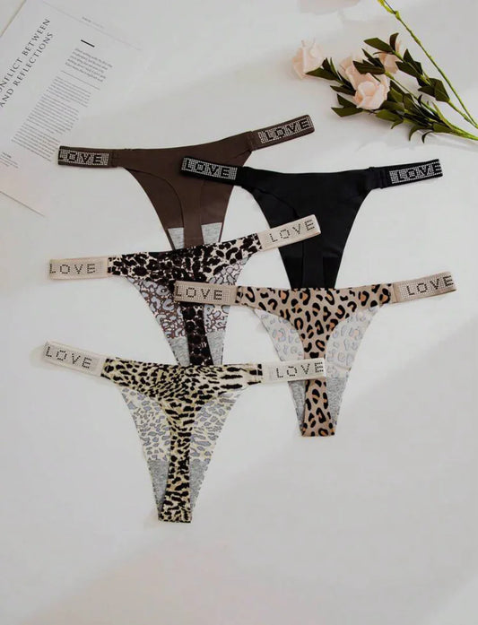 5 piezas Tanga con estampado de leopardo de cintura con cinta con letra