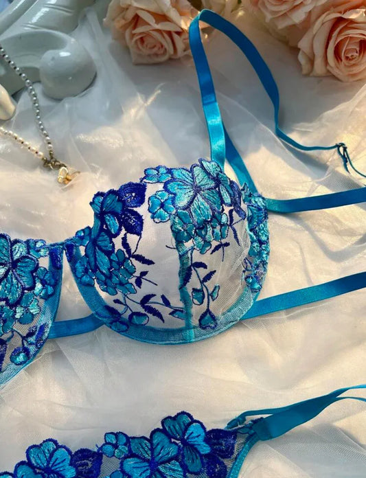Conjunto de lencería de 2 piezas para damas con tirantes bordados en azul celeste