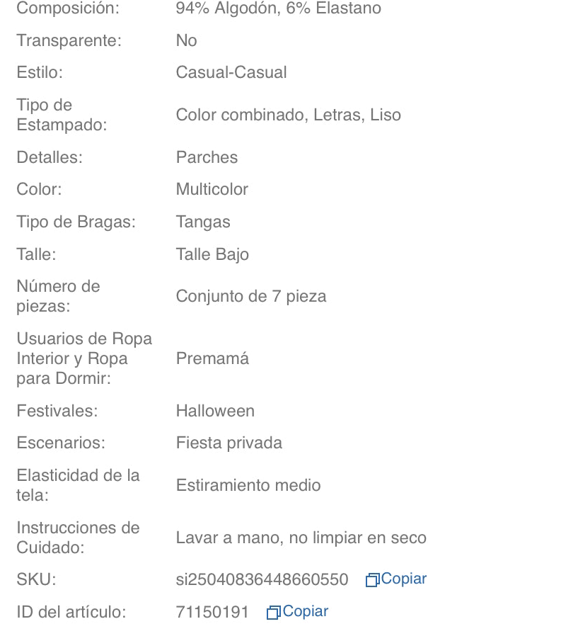 Set de 7 piezas de ropa interior sin costuras (tanga) algodón